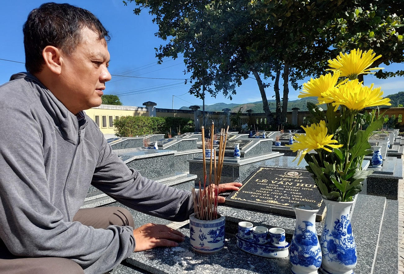 Ông Nguyễn Ngọc Toản, thôn Bàu, xã Tiến Hoá dâng hương tưởng nhớ tại phần mộ người thân sáng 26/7. |