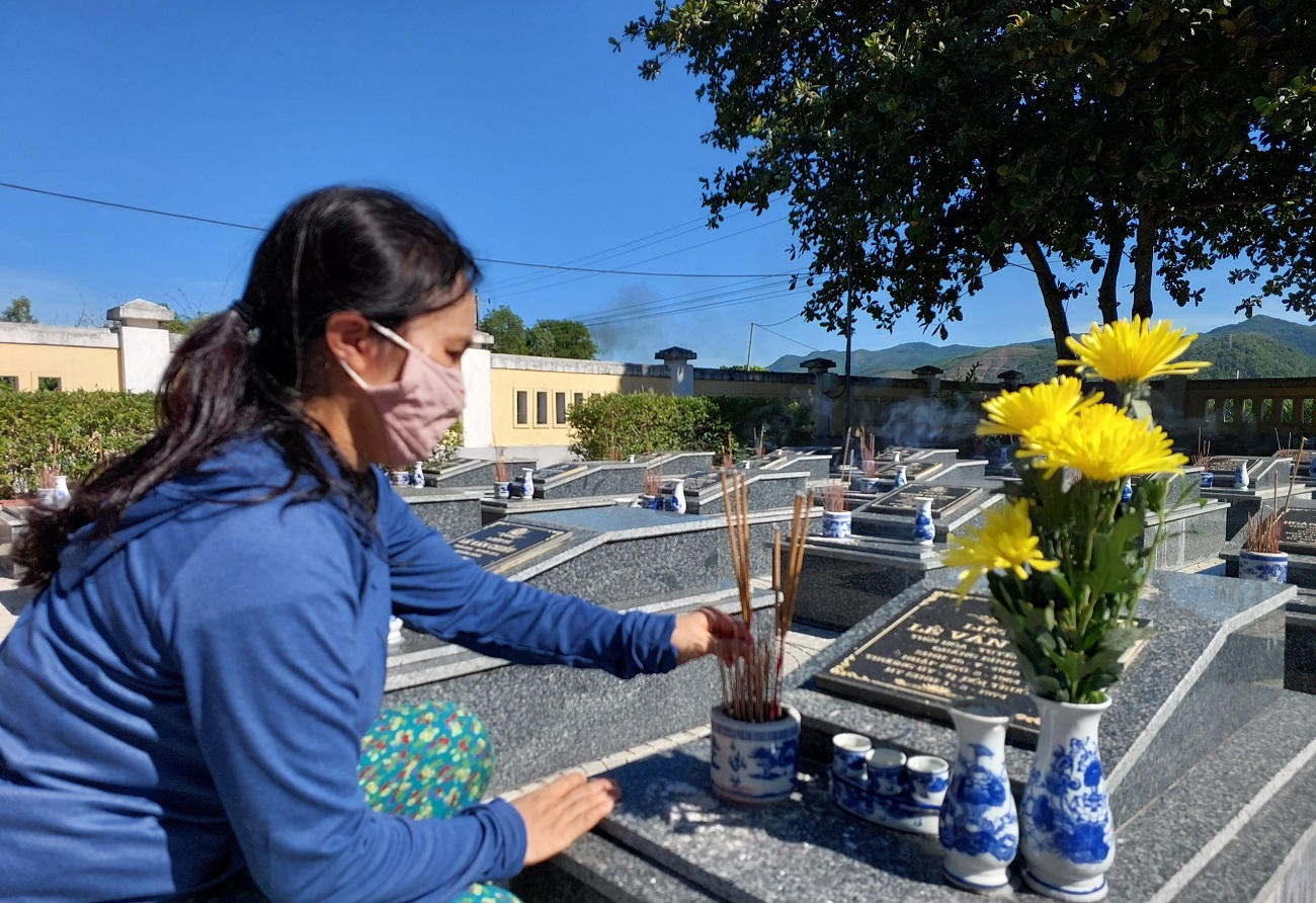 Chị Lê Thị Kim Dung, thôn Bàu, xã Tiến Hóa dâng hương tưởng nhớ phần mộ người thân sáng 26/7. |