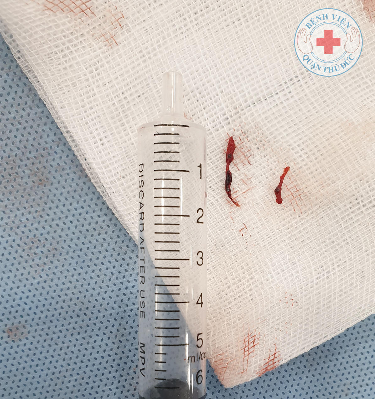 Các dải huyết khối lớn hút ra được từ mạch vành của bệnh nhân. Ảnh: BVCC