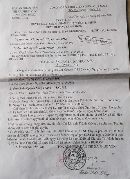 Sau khi 2 vợ chồng ly hôn, Lý được Tòa án nhân dân thị xã Phúc Yên quyết định được quyền nuôi cháu Long, anh Thành mặc dù muốn nuôi cháu Long nhưng ở thời điểm 2 vợ chồng ly hôn (tháng 2/2011) cháu Long mới 5 tuổi. Vì vậy, anh Thành đồng ý để Lý nuôi con và đợi con đủ 9 tuổi, khi đó theo quy định tại khoản 2, điều 92 Luật hôn nhân và gia đình cháu có nguyện vọng ở với ai thì người đó được quyền đón cháu về.