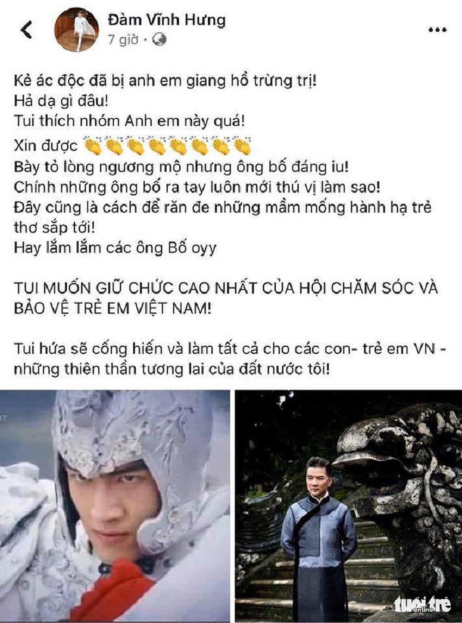 Quay lại với câu chuyện của trang facebook có tên Đàm Vĩnh Hưng, trước đó, người này từng nhiều lần lên tiếng về những trường hợp bức xúc trong xã hội. Tuy nhiên, những kêu gọi ấy chỉ dừng lại ở việc cùng lên tiếng trước cái xấu, cần lực lượng chức năng nhanh chóng xử lý hành vi phạm pháp, thế nên anh được ủng hộ.