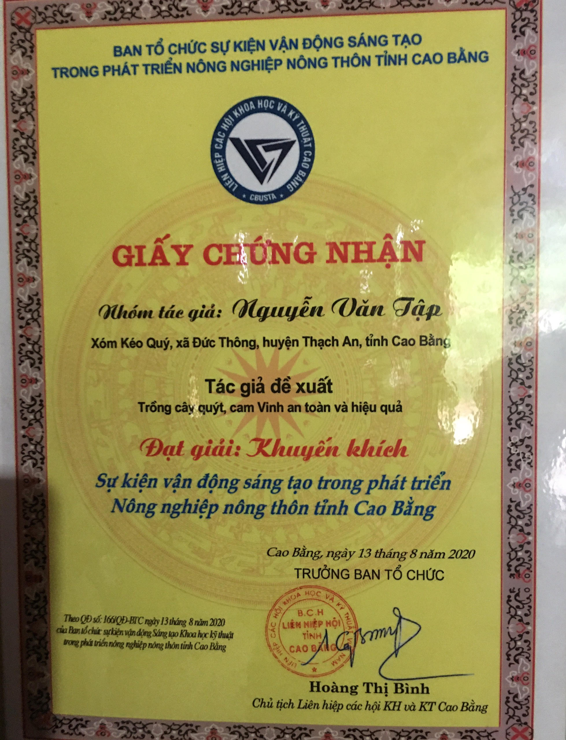 Từ khi đầu tư trồng cây cam, quýt kinh tế gia đình anh Tập đã được cải thiện hơn rất nhiều, tuy nhiên do người dân trong địa phương chưa tập trung phát triển mô hình này rộng rãi nên cam, quýt ở xã Đức Thông, huyện Thạch An vẫn chưa trở thành hàng hóa để đưa ra thị trường lớn. Vào mùa thu hoạch, vợ chồng anh chị chủ yếu vẫn tự chở xe lên thị trấn, thành phố để buôn bán lẻ.Tháng 8/2020 vừa qua, anh Nguyễn Văn Tập đã vinh dự giành giải khuyến khích ở đề tài “Trồng cây quýt, cam Vinh an toàn và hiệu quả” trong “Sự kiện vận động sáng tạo trong phát triển Nông nghiệp nông thôn tỉnh Cao Bằng”.