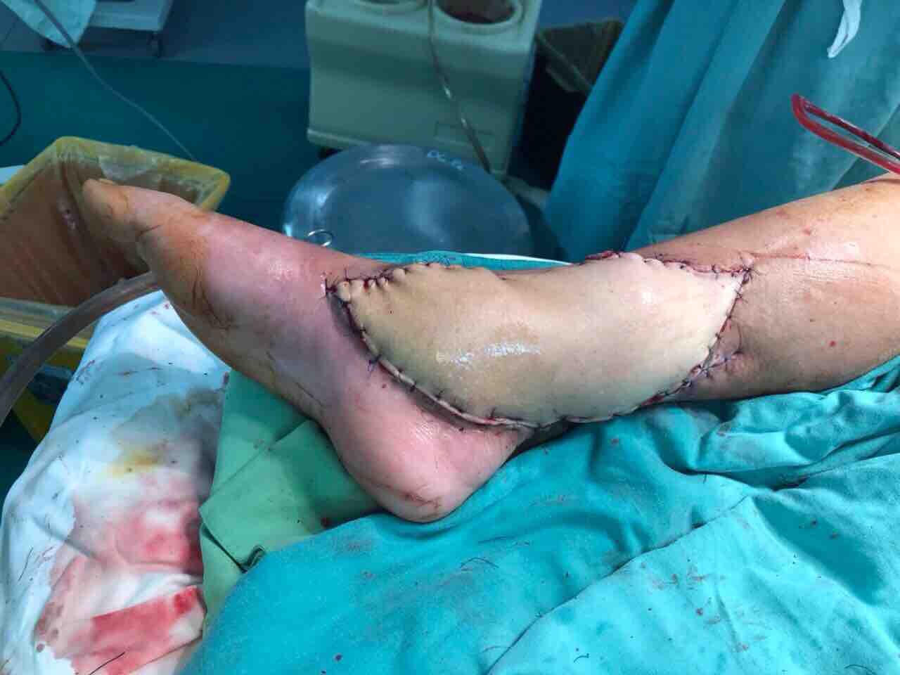 Sau đó, bệnh nhân được chỉ định cắt lọc tổ chức hoại tử nhiều lần kèm hút áp lực âm bằng hệ thống VAC. Khi đáy vết thương sạch, mép vết thương gọn gàng, toàn trạng bệnh nhân ổn định, các bác sĩ đã lên lịch tạo hình che phủ khuyết hổng bằng vạt tư do vi phẫu ALT (vạt đùi trước ngoài) lấy ở đùi phải với hai cuống mạch nuôi được cắt rời ra và đưa đến nối vào một là đông mạch chày sau và một là động mạch mu chân. Miệng nối được thực hiện cả động mạch và tĩnh mạch dưới sự hỗ trợ của kính hiển vi.