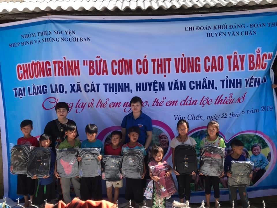 Nhóm thiện nguyện của chị Điệp còn tổ chức phá cỗ tết trung thu “Ánh trăng vùng cao”, trao quà cho trẻ em nghèo 1.000 suất tại xã Nậm Mười, 600 suất tại xã Sùng Đô của huyện Văn Chấn, 300 suất tại thôn Chống Tầu, xã Làng Nhì, huyện Trạm Tấu, tổng trị giá 70 triệu đồng.