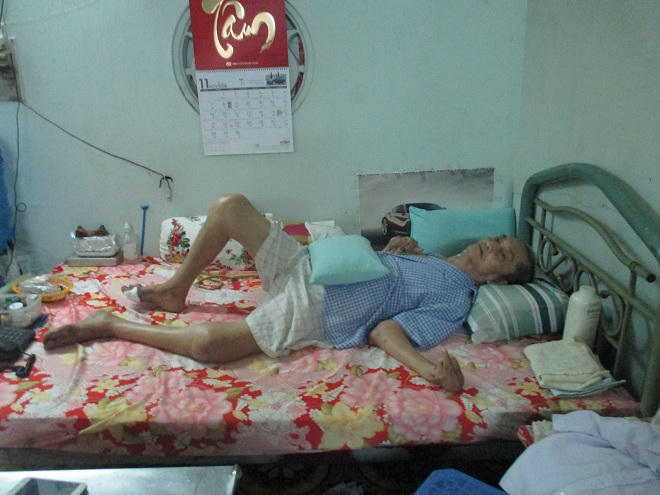 Phía bên trong, chồng bà, ông Trần Văn Tâm (76 tuổi) nằm co ro trên chiếc giường nhỏ, đôi bàn tay co quắp, không thể cầm nắm, đôi chân phình to, lở loét, thi thoảng lại run lẩy bẩy. Ông Tâm bị tai biến, nằm liệt giường đã hơn 10 năm nay.