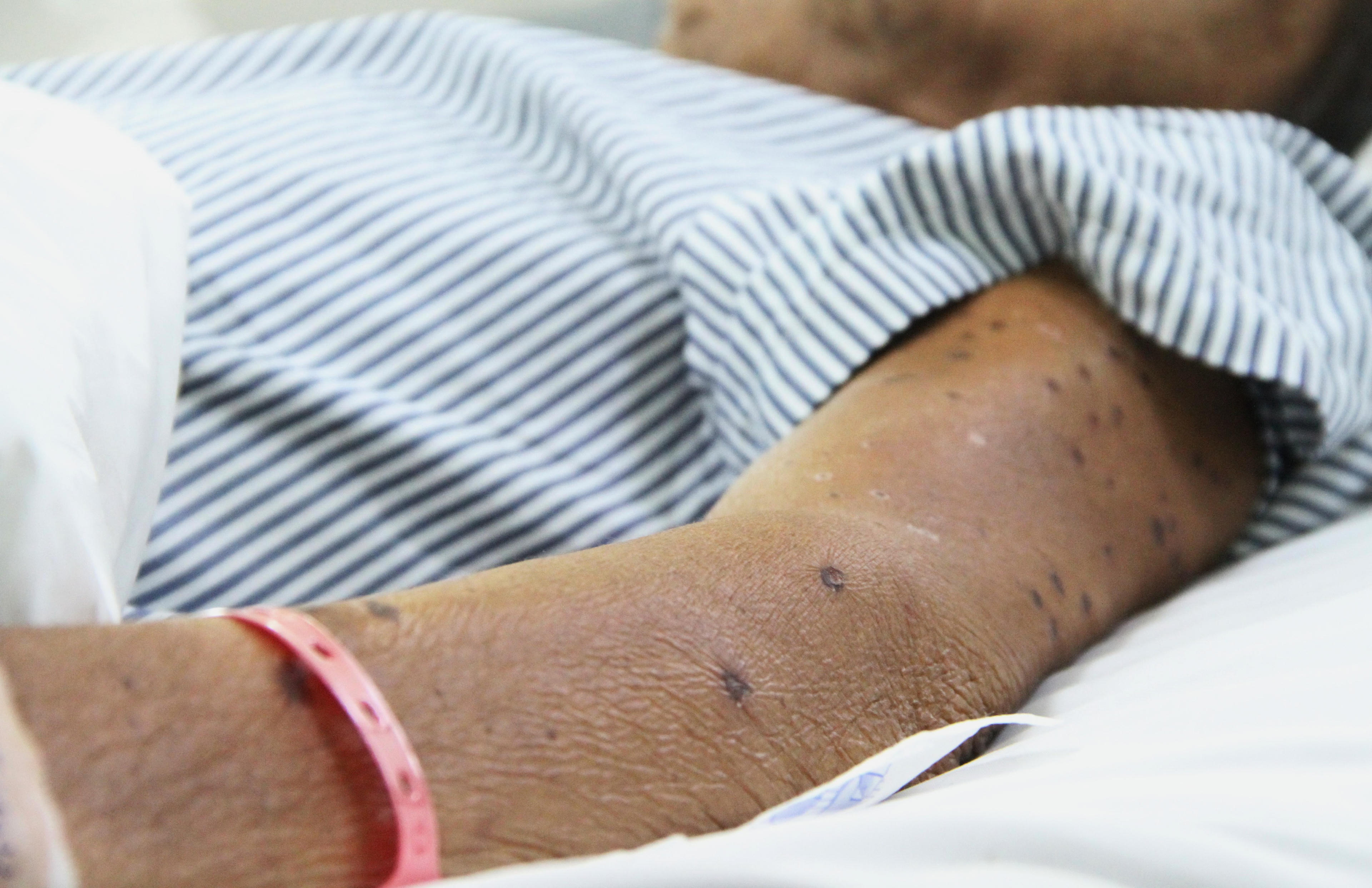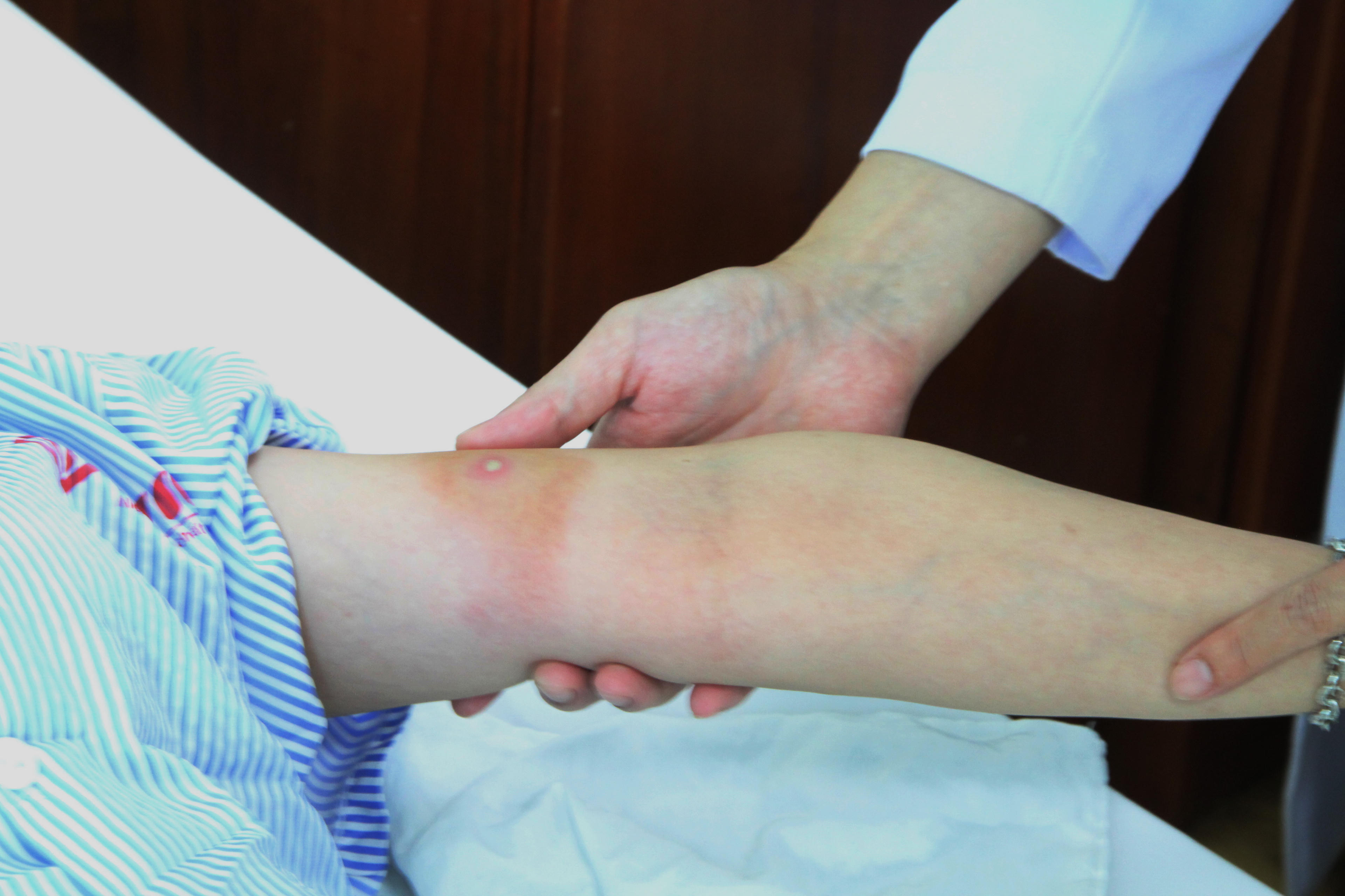 Bệnh nhân T.T.C.N (34 tuổi, ngụ tại huyện Vĩnh Lợi, tỉnh Bạc Liêu), bị ong bắp cày đốt trên cánh tay. |