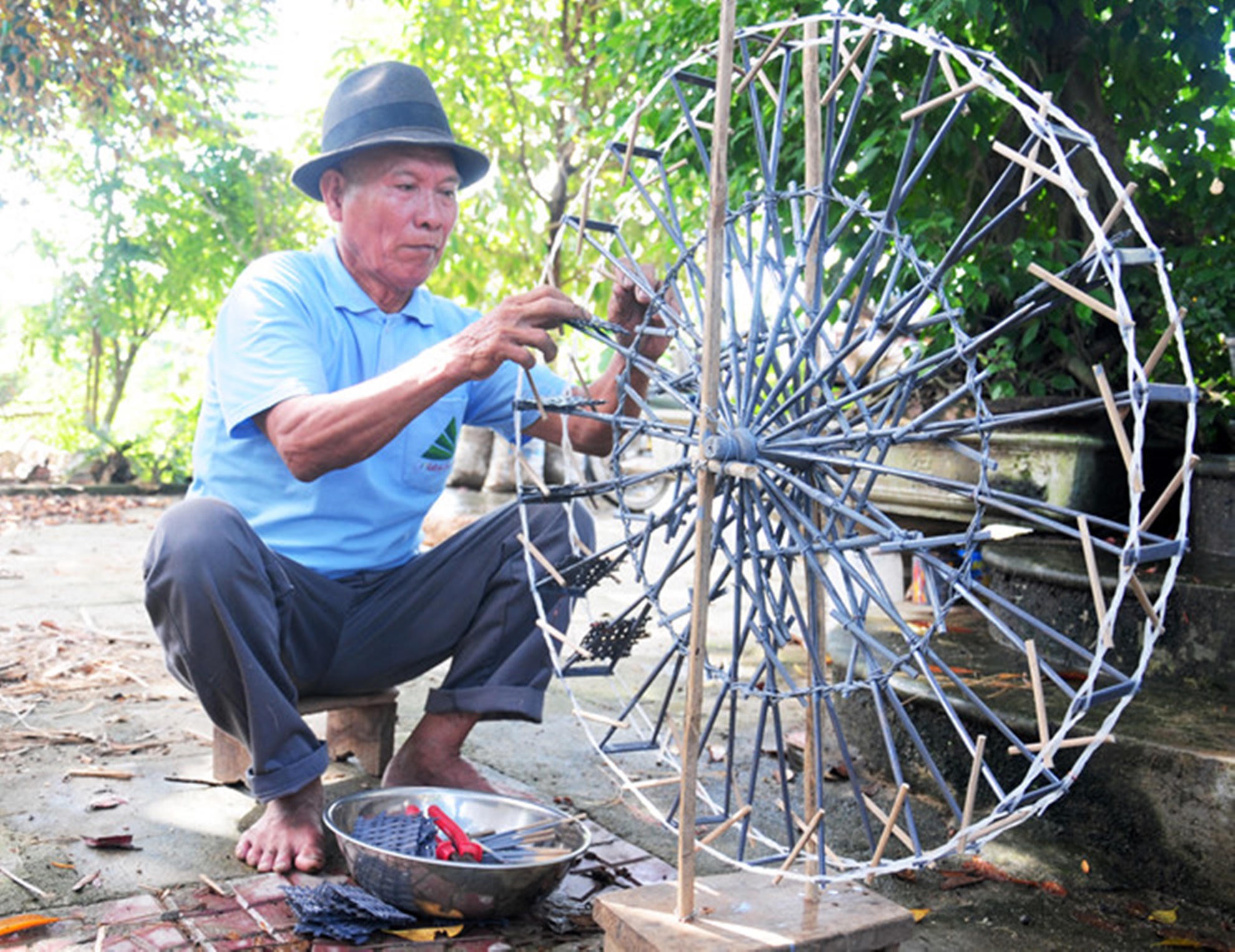 “Đó là thực tế bờ xe nước xưa kia, còn bây giờ tôi làm những mô hình bờ xe thu nhỏ, đường kính từ 2 - 4m. Mỗi bờ xe có từ 2 - 4 bánh, tùy theo khách họ đặt về trưng bày ở đâu. Hồi xưa, các vật liệu chưa có nên phần lớn bờ xe được buộc bằng dây rừng, còn tôi làm mô hình thì làm bằng dây kẽm, dây đồng, cước để kết các chi tiết bằng tre của bánh xe nước lại với nhau, rồi phủ thêm lớp sơn màu bạc bên ngoài nhằm tăng tuổi thọ. Công đoạn khó nhất khi làm một bánh xe nước là làm bánh cho cân bằng để khi vận hành không bị lỗi, quay vòng trơn tru”, ông Quýt cho biết.