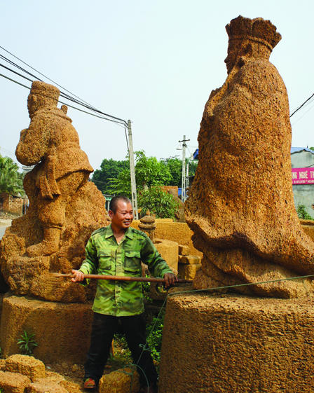 Những năm 1990, đá ong “thất sủng”. Không có việc, ông đi xin tạc tượng bằng chất liệu gỗ ở tỉnh ngoài. Làm được gần chục năm, ông bị tai nạn. Chân tập tễnh không thể đi xa, ông về quê nhà tìm việc. Ruộng ít, ông chẳng có việc để làm. Nhìn những vỉa đá ong vàng óng, ông chợt lóe lên ý nghĩ, sao không biến chúng thành những con vật sống động.