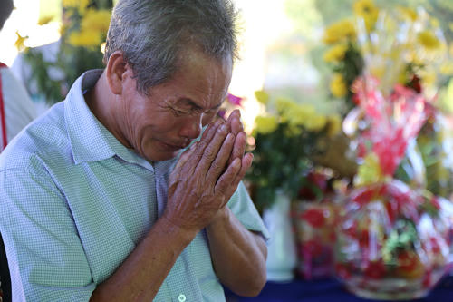 Vào đến khuôn viên nghĩa trang, đôi mắt ông Thuận đỏ hoe vì xúc động, bàn tay run run khi thành kính dâng hương lên anh trai cùng 37 đồng đội khác vừa được quy tập về đây.