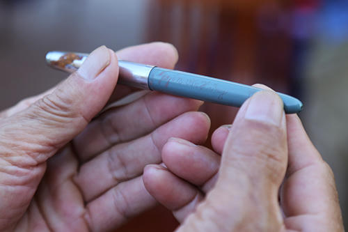 Chiếc bút có khắc tên hai vợ chồng giúp xác định thân nhân cho liệt sĩ. Ảnh: Hoàng Táo |