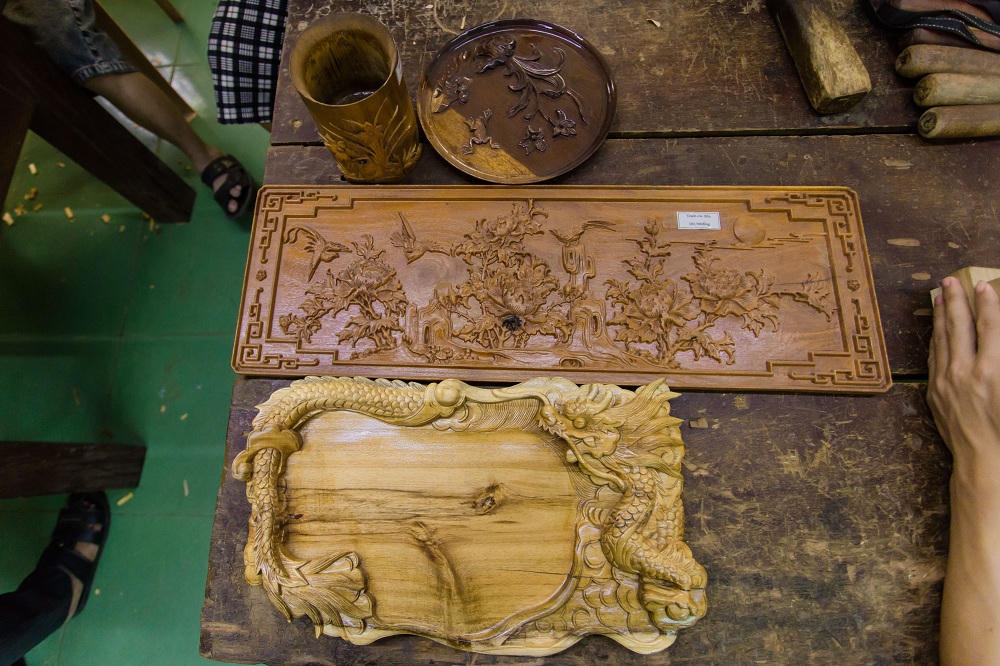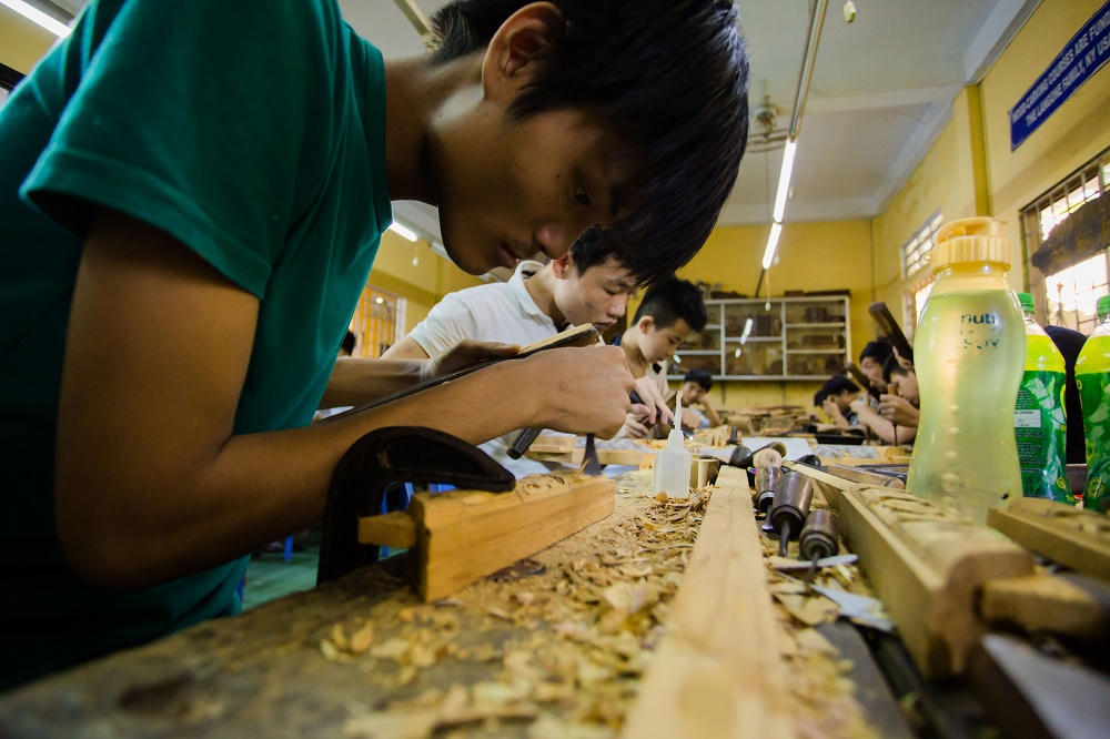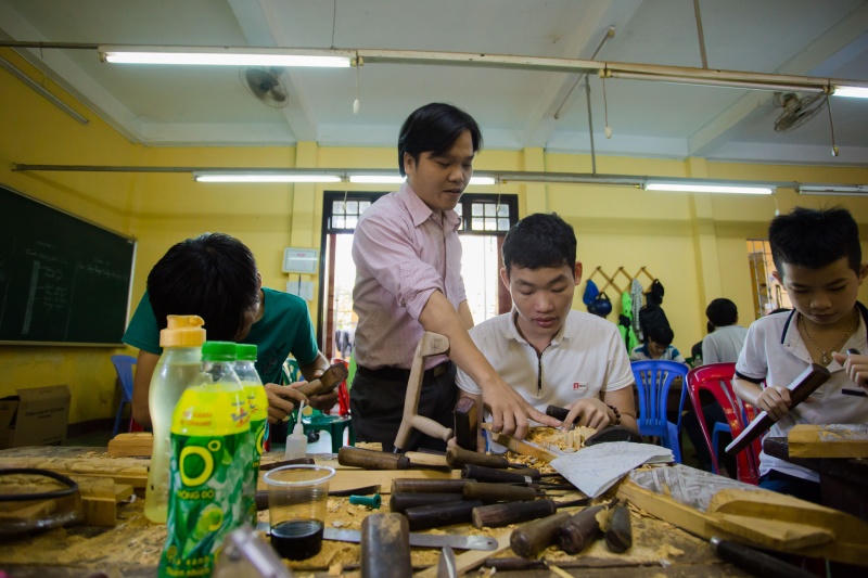 Trong lớp học, bên tiếng lóc cóc đục đẽo những bức phù điêu tinh xảo là tiếng lộc cộc từ đôi nạng của thầy tới chỗ ngồi từng học viên, tận tình hướng dẫn, chỉnh sửa, nắn nót từng nét trên các thớ gỗ. Từ những thanh gỗ không hình hài, các học viên dần biến thành tranh long lân quy phụng hay những bức tượng tinh xảo.