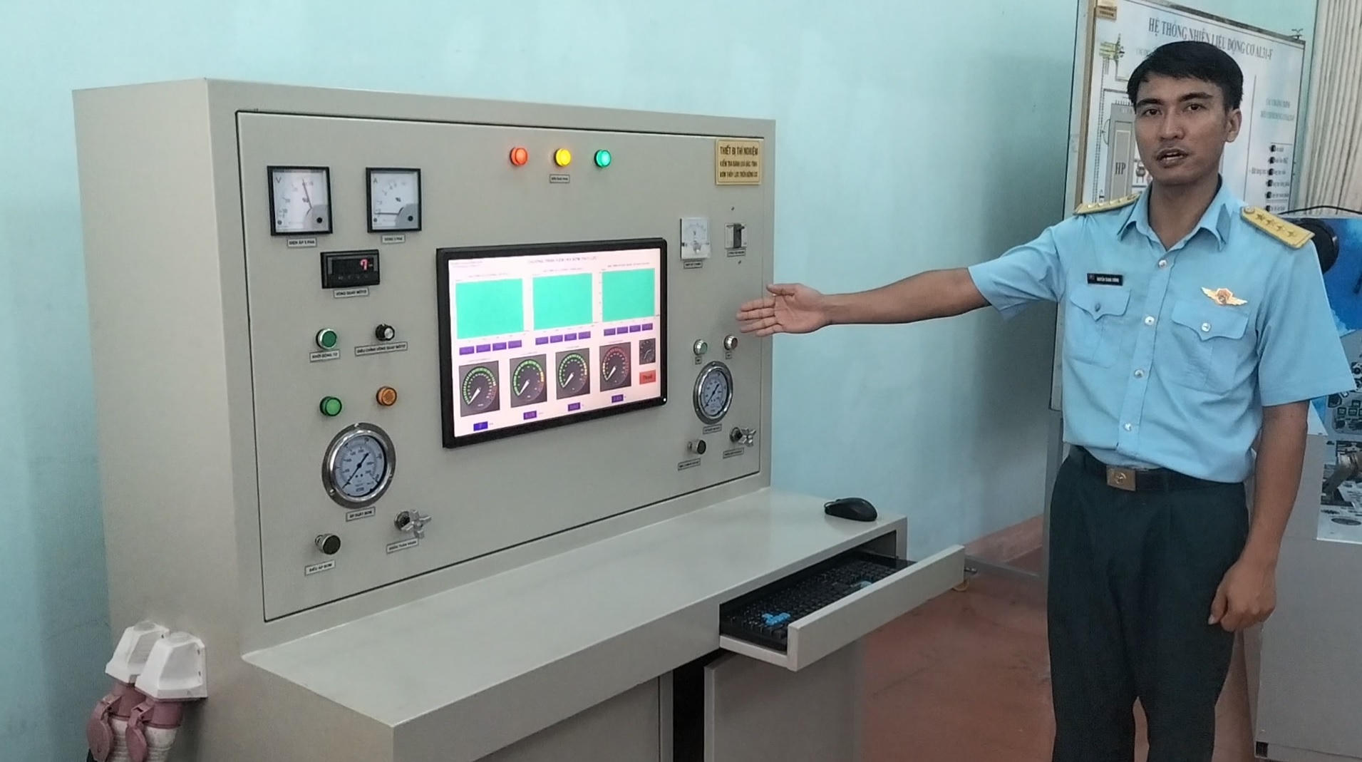 Đại úy Nguyễn Thanh Cường hướng dẫn sử dụng thiết bị kiểm tra bơm thủy lực trên động cơ hàng không. |