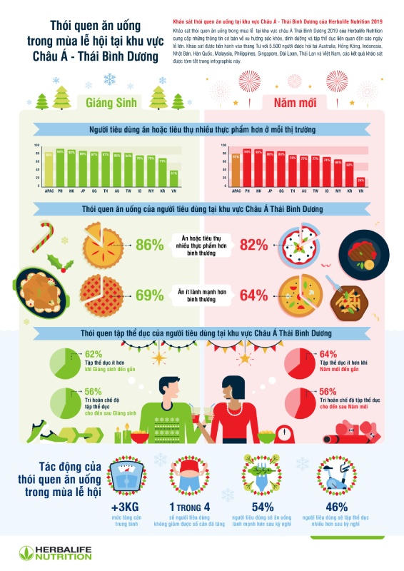 Do ăn quá nhiều và tập thể dục ít hơn vào các ngày lễ, người tiêu dùng châu Á - Thái Bình Dương nhận thấy họ tăng trung bình 3 kg sau kỳ nghỉ Giáng sinh và năm mới. Để giảm cân, hơn một nửa (54%) người tiêu dùng châu Á - Thái Bình Dương sẽ ăn uống lành mạnh hơn và 46% sẽ nỗ lực tập thể dục nhiều hơn sau khi lễ hội kết thúc.