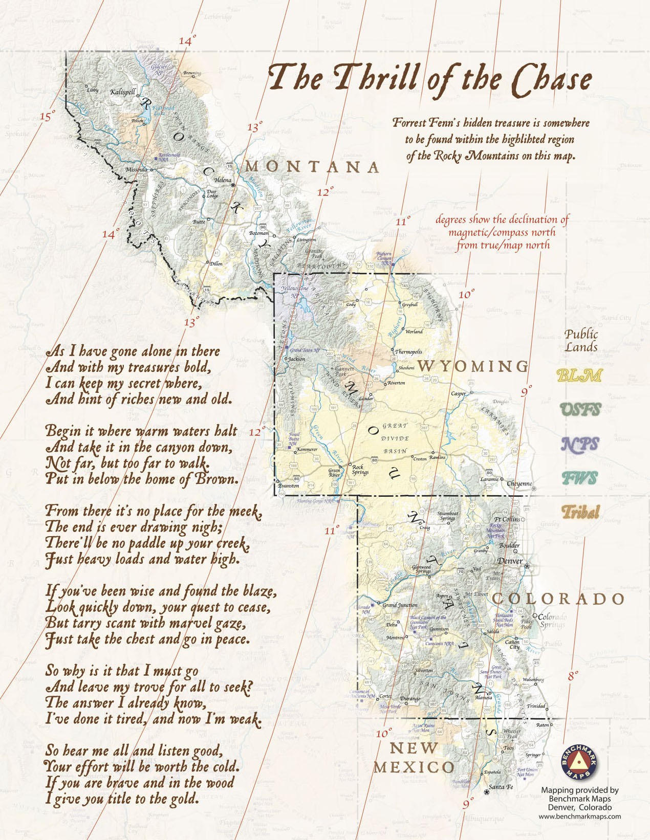 Trong cuốn sách, có một bài thơ in trên tấm bản đồ vùng cất giấu kho báu. Fenn cho biết phải đọc bài thơ và tìm ra 9 manh mối, xâu chuỗi chúng lại với nhau để tìm đường đến kho báu.Đây là một câu trích trong bài thơ:“Bắt đầu ở nơi dòng nước ấm tạm ngưng/ Và đi xuống nơi hẻm núi sâu/ Không xa, nhưng quá xa để đi bộ/ Đặt dưới ngôi nhà của Brown”.
