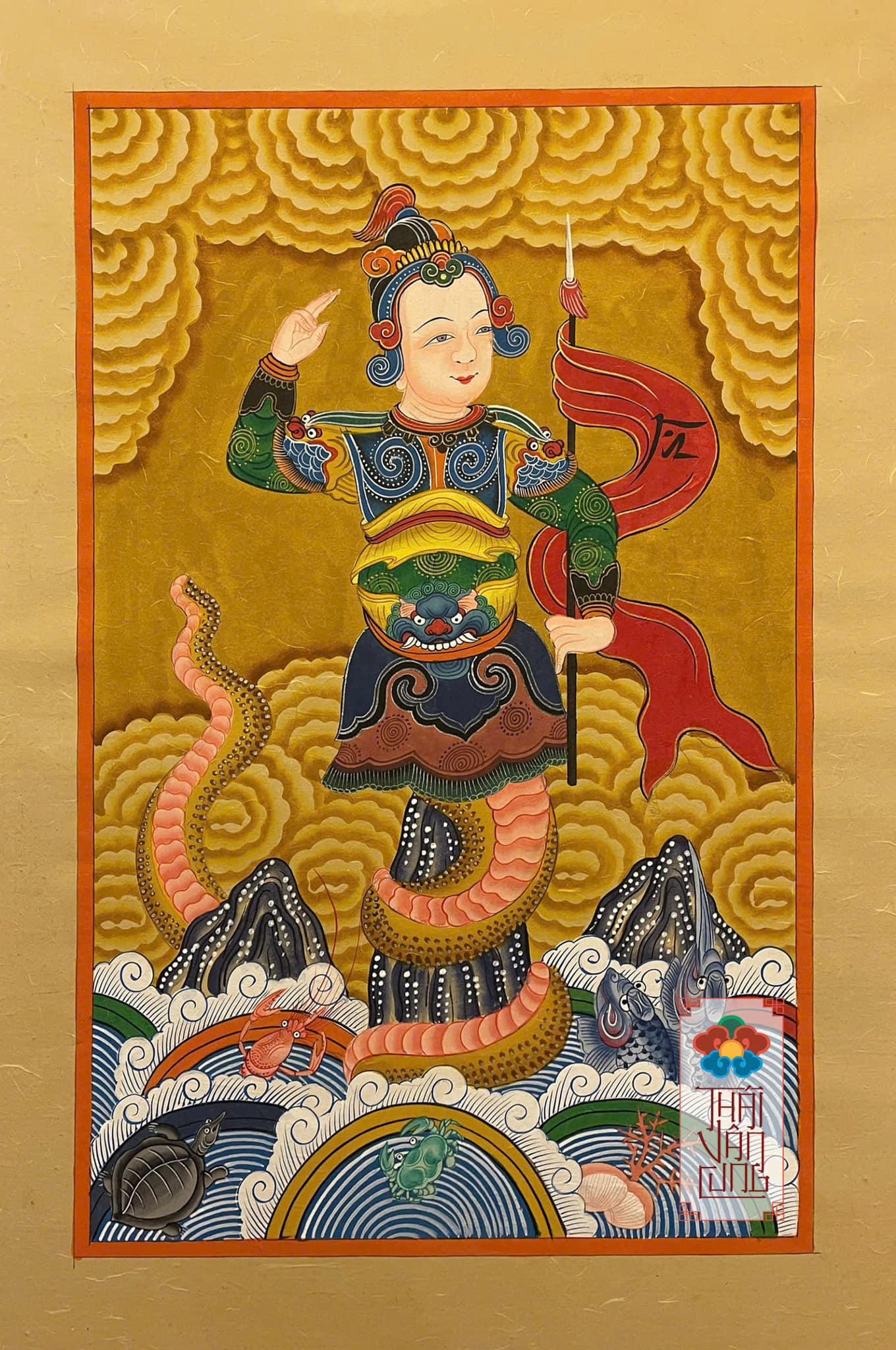 Tranh “Linh Lang hóa giảo long” tái hiện sinh động về huyền tích Linh Lang Đại vương. |