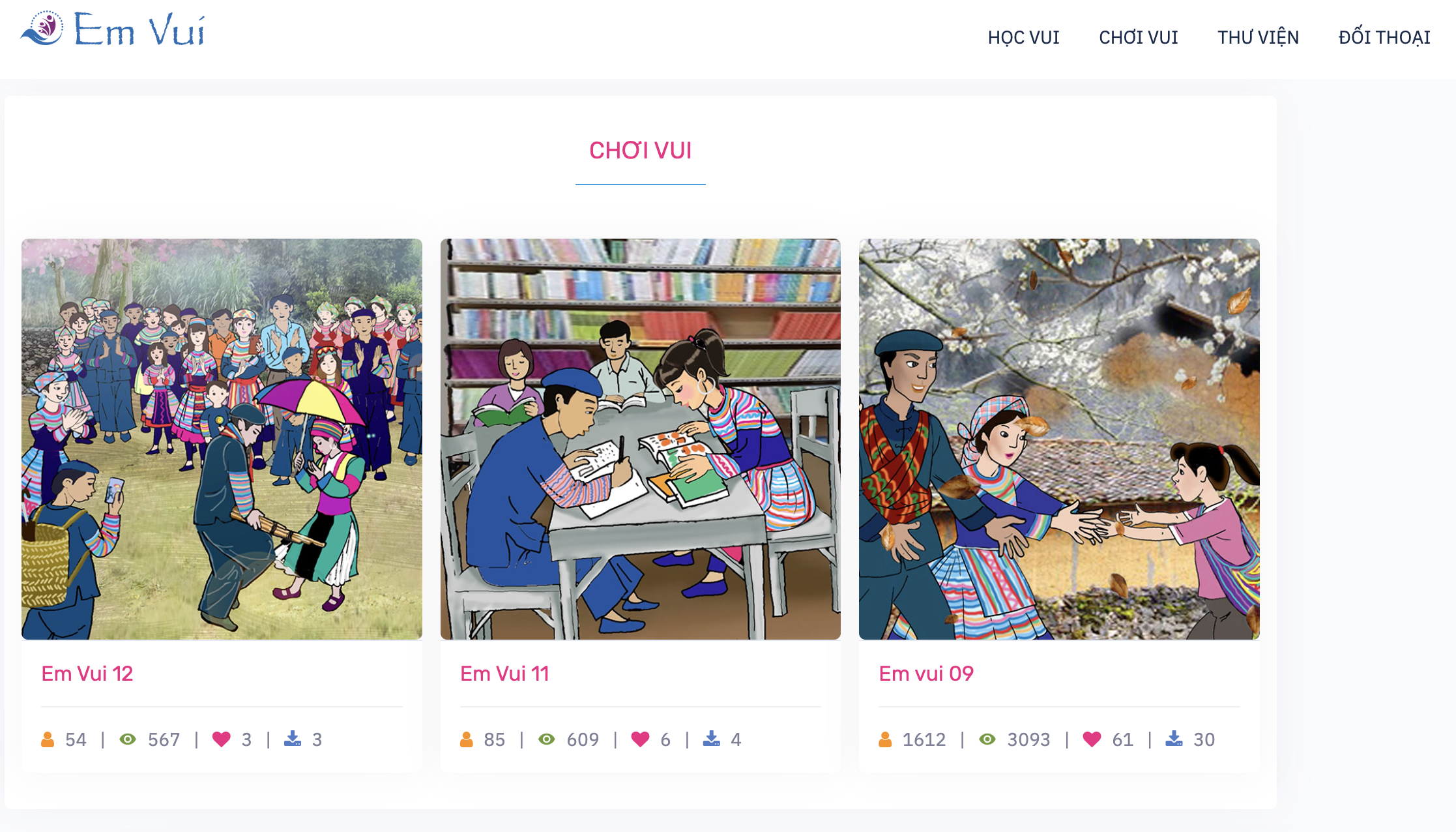 Ra mắt vào năm 2021, nền tảng “Em Vui” (phối hợp thực hiện bởi Viện Nghiên cứu Phát triển Xã hội và Tổ chức Plan International tại Việt Nam) là không gian kỹ thuật số trang bị cho trẻ em, nam nữ thanh niên dân tộc thiểu số những kiến thức, kỹ năng để các em có thể chủ động phòng tránh tảo hôn và nạn mua bán người. Lấy nền tảng trực tuyến làm bệ phóng truyền tải thông tin, “Em Vui” đã được thiết kế và hoàn thiện trên nền tảng website, ứng dụng điện thoại và các kênh mạng xã hội (Facebook, Zalo, Tiktok, Youtube, Instagram, Twitter).