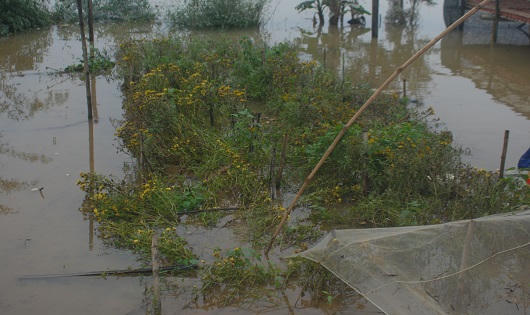 Cả gia đình trông chờ vào vườn hoa màu này, mong có thu hoạch cao trong dịp Tết, nhưng lũ ập đến nhanh khiến hàng ngàn chậu hoa và hơn 1.000m2 cúc, vạn thọ của gia đình ông bị ngâm sâu trong dòng nước lũ, chỉ cố kịp vớt lại phần nào chậu cúc con.
