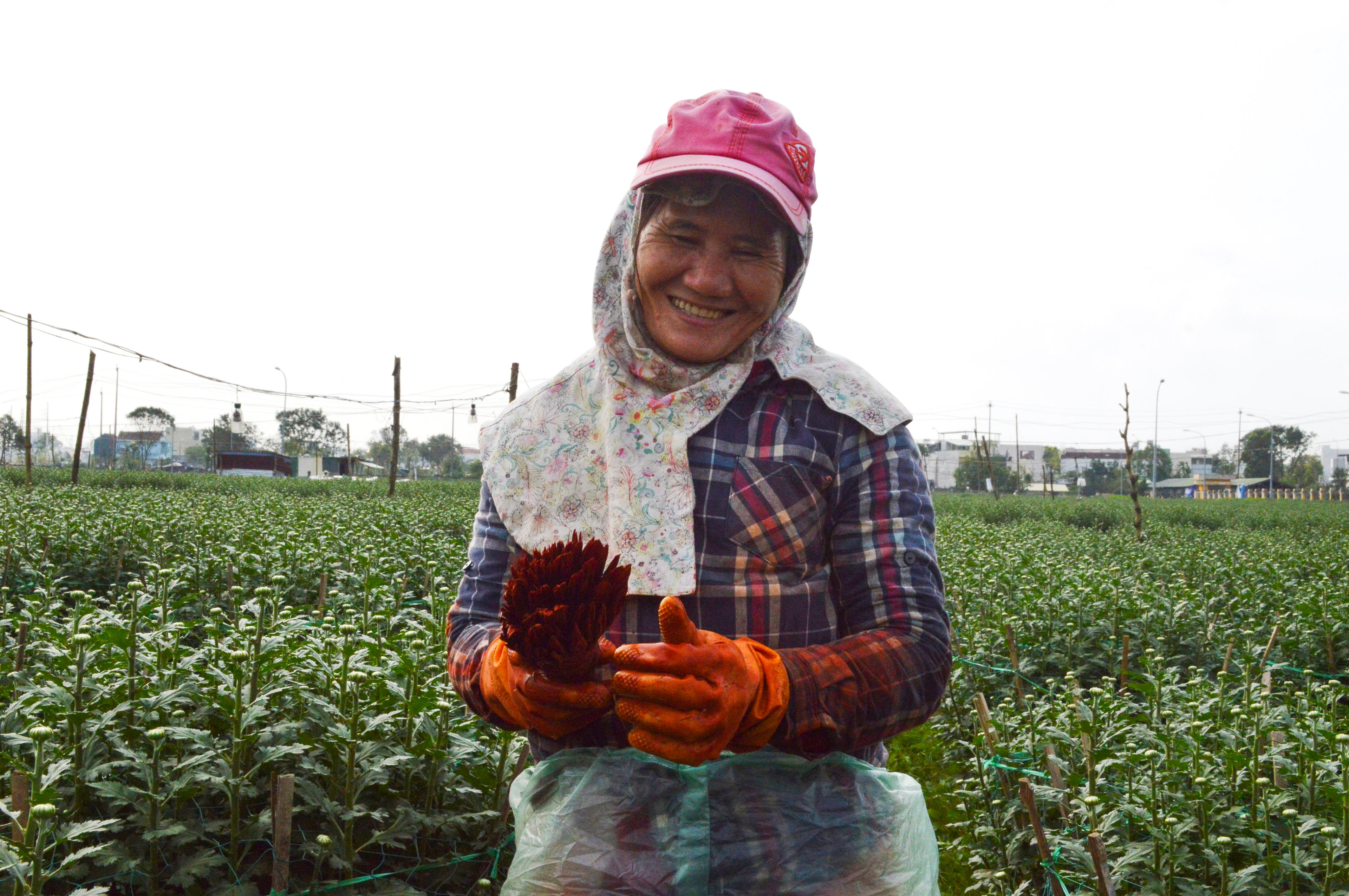 Lom khom dùng chổi quét màu đỏ cho từng chậu hoa, bà Hoa (54 tuổi) ở xã Nghĩa Hoà huyện Tư Nghĩa tâm sự, cơn bão số 9 vừa qua khiến nhà cửa bà bị hư hỏng nặng, cuộc sống gặp nhiều khó khăn, bà đi làm công để kiếm ít tiền tiêu trong dịp Tết. Sau khi sạ lúa xong, bà lên đây để làm công, ngày được 180 ngàn đồng, trừ đi chi phí cơm nước, bà còn được hơn 100 ngàn đồng một ngày.