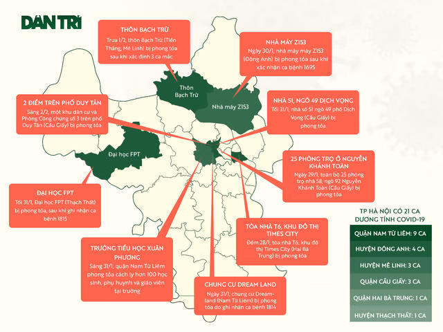 Bản đồ 9 khu vực ở Hà Nội đang bị phong tỏa do Covid-19 đến ngày 2/2. Đến sáng 4/2, Hà Nội đã gỡ phong tỏa với Đại học FPT.