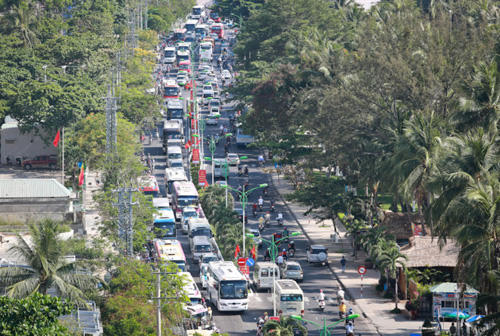 Tương tự, TP biển Nha Trang sáng 29/4 cũng kẹt cứng khi hàng trăm đoàn xe lớn, nhỏ chở du khách cùng đổ về phía nam đường Trần Phú. Xe cộ nối đuôi nhích từng chút dài hơn 1km để di chuyển (Ảnh: Tuổi trẻ)