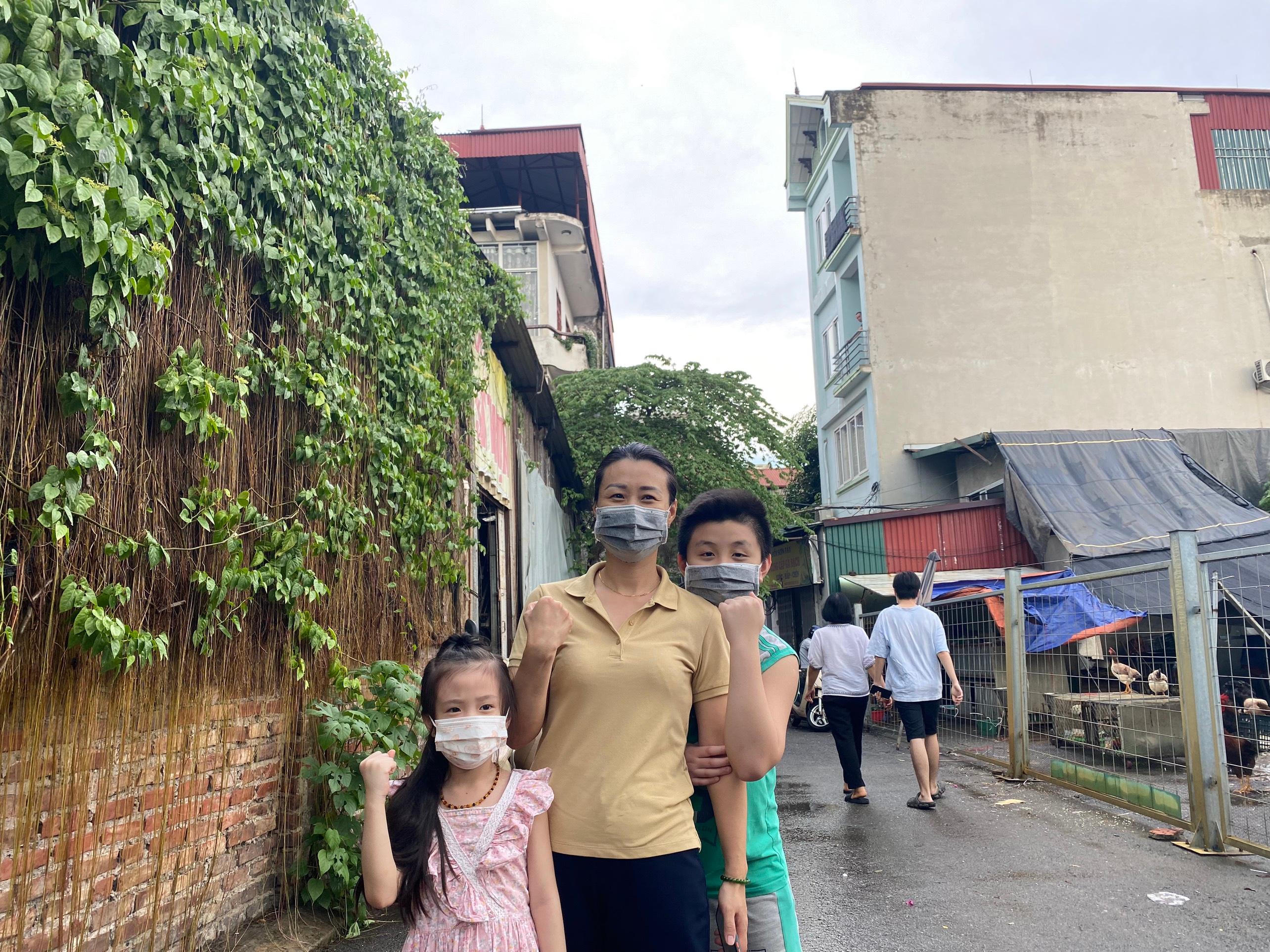 3 mẹ con chị Bùi Thị Hương phấn khởi đi xét nghiệm COVID-19. Ảnh: Mỵ Châu |