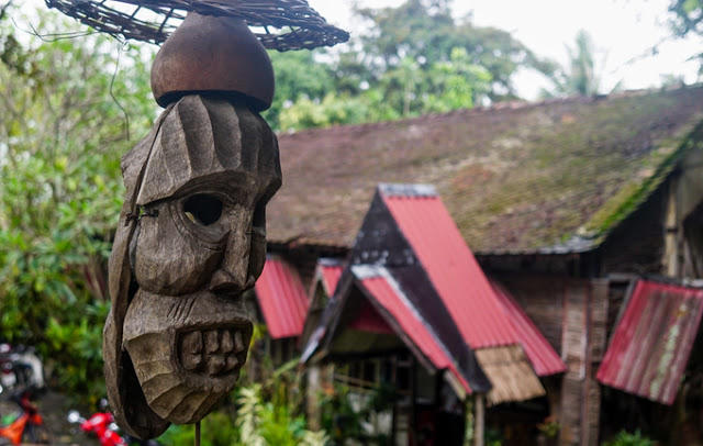 Toàn bộ không gian phía trước bao phủ bởi cây xanh tán lá khá rậm rạp, ẩn hiện trong đó là những bức tượng, những khuôn mặt bằng gỗ, sắt với đủ mọi sắc thái đầy ma quái. Nếu không chuẩn bị trước tâm lý có lẽ nhiều du khách sẽ co giò bỏ chạy vì nghĩ mình đã vô tình đi lạc vào một khu nhà mồ nào đó của người dân tộc Bana.