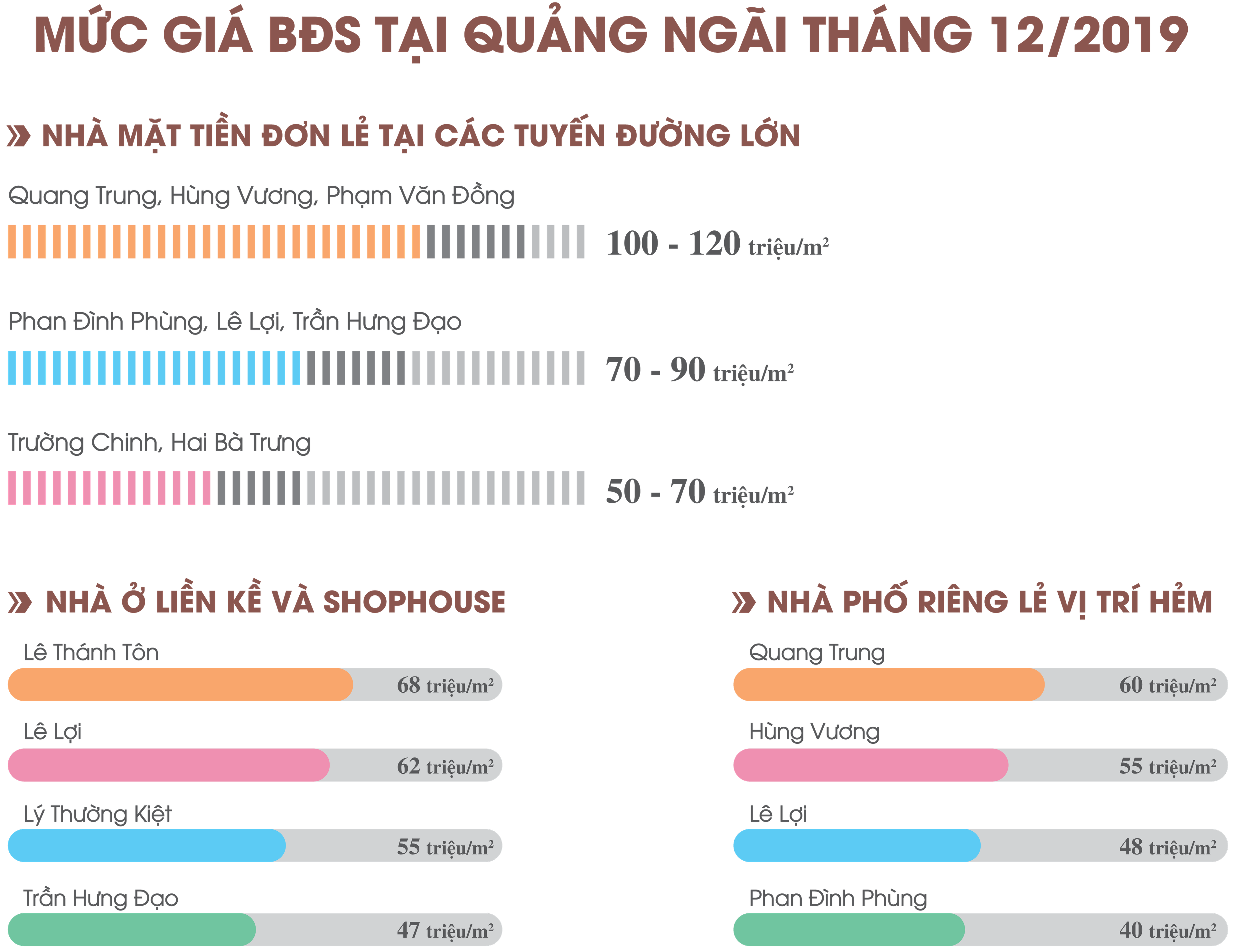 Ở nhóm nhà mặt tiền đơn lẻ các tuyến đường lớn như Quang Trung, Hùng Vương, Phạm Văn Đồng có giá bình quân là 100 - 120 triệu đồng/m2; các tuyến đường như Phan Đình Phùng, Lê Lợi, Trần Hưng Đạo có mức giá bình quân 70 - 90 triệu đồng/m2; các tuyến đường Trường Chinh, Hai Bà Trưng đạt 50 - 70 triệu đồng/m2.