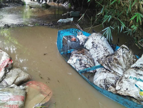 Xe tải chở dầu nhớt thải đổ trộm vào khe núi xã Phú Minh, Kỳ Sơn (Hòa Bình), sau đó dầu lan vào kênh dẫn của Nhà máy nước sạch sông Đà.