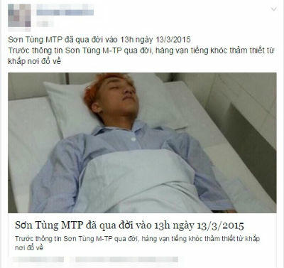 Không chỉ người nổi tiếng như Đàm Vĩnh Hưng mà cả những ca sĩ trẻ cũng bị dính vào “bẫy chết” này của cư dân mạng. Sơn Tùng MT-P một sáng ngủ dậy đã rơi vào trạng thái “trên trời rơi xuống” khi tận mắt đọc thông tin mình… chết do tai nạn. Thậm chí đi kèm tin còn có ảnh minh họa như thật, ca sĩ đang nằm trên giường, mặt mũi bợt bạt.