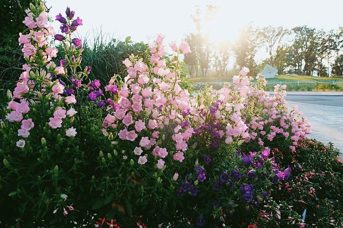 Một khóm hoa chuông với các màu hồng phớt, tím.