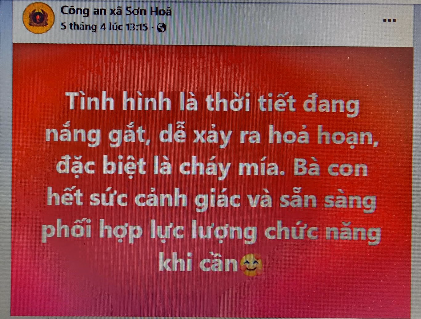 Để phòng ngừa nguy cơ cháy và giảm thiểu rủi ro, Công an xã Sơn Hòa cũng đã phát đi cảnh báo: “Tình hình là thời tiết đang nắng gắt, dễ xảy ra hỏa hoạn, đặc biệt là cháy mía. Bà con hết sức cảnh giác và sẵn sàng phối hợp lực lượng chức năng khi cần”.