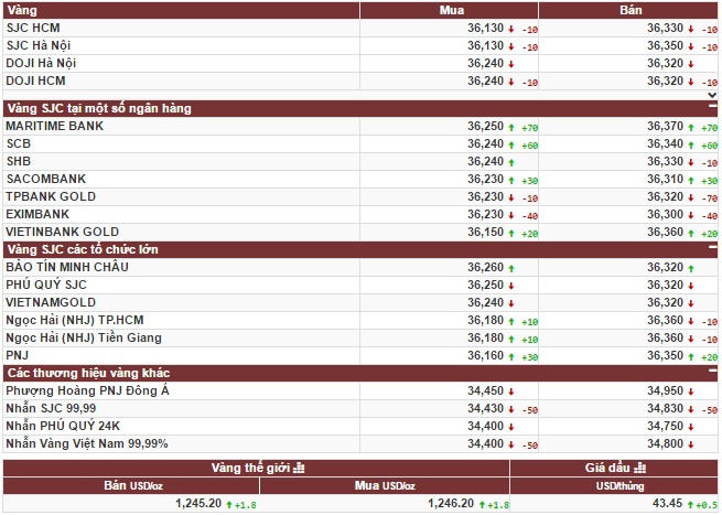 Công ty vàng bạc đá quý Sài Gòn niêm yết giá vàng SJC ở mức 36,15 triệu đồng/lượng (mua vào) và 36,37 triệu đồng/lượng (bán ra), tăng 10 ngàn đồng ở cả 2 chiều mua vào và bán ra so với cuối giờ chiều ngày 20/6.