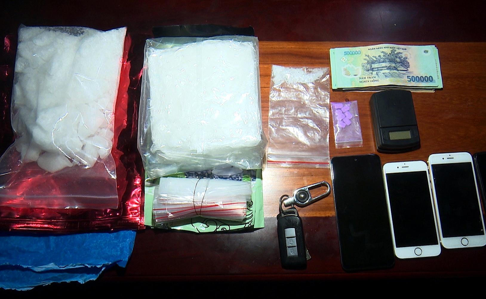 Qua kiểm tra phương tiện, lực lượng chức năng phát hiện 4 bịch nilong chứa các khối tinh thể màu trắng và 7 viên nén màu hồng nghi là ma túy với tổng trọng lượng trên 1,6 kg, số tiền gần 45 triệu đồng, 2 sổ tay có ghi chép các thông tin liên quan hoạt động mua bán trái phép chất ma túy cùng một số tang vật khác có liên quan.