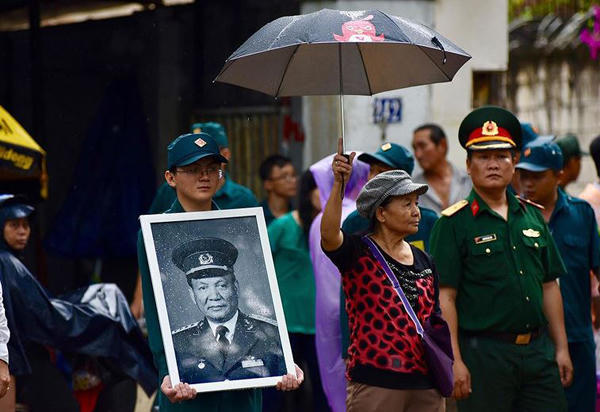 Lực lượng dân quân tự vệ mang theo di ảnh cố Đại tướng, đứng thành từng tốp nhỏ chờ đón linh cữu đi qua.