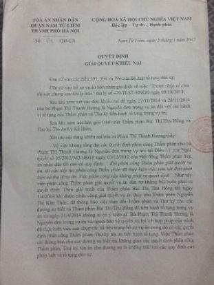 Được biết, ngay trong ngày 1/9/2015, chị Hương đã có Đơn khiếu nại khẩn cấp gửi tới Chánh án TAND quận Nam Từ Liêm, Viện trưởng VKSND quận Nam Từ Liêm và Chánh án TAND TP Hà Nội đối với Quyết định hoãn phiên tòa số 33/2015/QĐST-HPT ngày 31/8/2015.