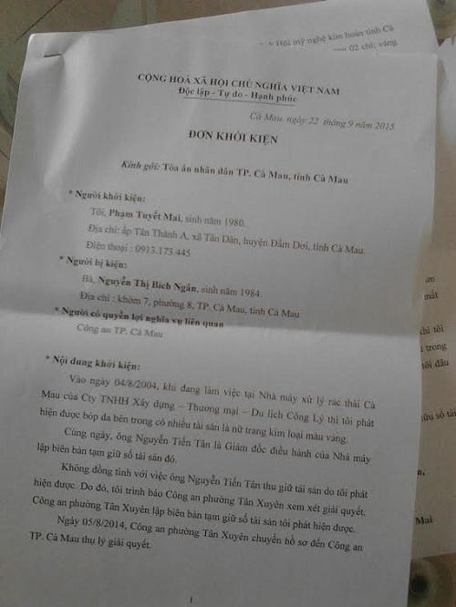 Vụ việc sẽ êm xuôi, nếu cơ quan công an Tp Cà Mau giải quyết theo quy định pháp luật. Ngược lại, lực lượng nhiệm vụ lại cho rằng số vàng trên là của chị Ngân, mặc dù biên bản mất vàng, số vàng nhặt được là không trùng khớp và để chị Mai và chị Ngân tự thỏa thuận nên mới xảy ra mâu thuẫn. Theo thỏa thuận, chị Ngân chỉ thống nhất cho chị Mai 10 triệu đồng nên chị Mai đã không đồng ý dẫn đến khởi kiện…