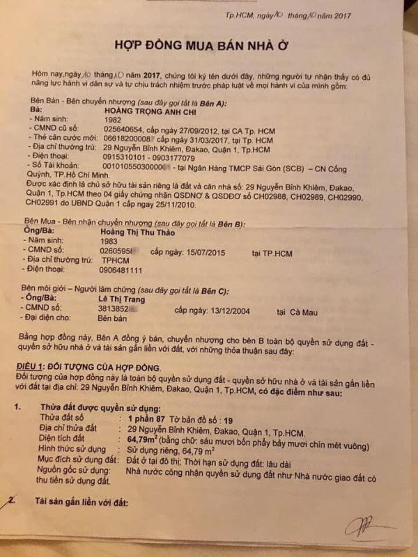 Tìm gặp bà Hoàng Thị Thu Thảo, phóng viên Báo Pháp luật Việt Nam được chị cho biết: "Vào ngày 10-10-2017, tôi có hợp đồng thoả thuận mua căn nhà số 29 Nguyễn Bỉnh Khiêm, phường Đa Kao, quận 1 của bà Hoàng Trọng Anh Chi (SN1982) với giá 25 tỉ đồng. Thời điểm đó, bà Hoàng Trọng Anh Chi đang xây nhà này (mới chỉ có 1 tầng). Tất cả tiền xây dựng, chi phí hoàn công thì tôi đều chuyển khoản cho bà Chi để thanh toán”.