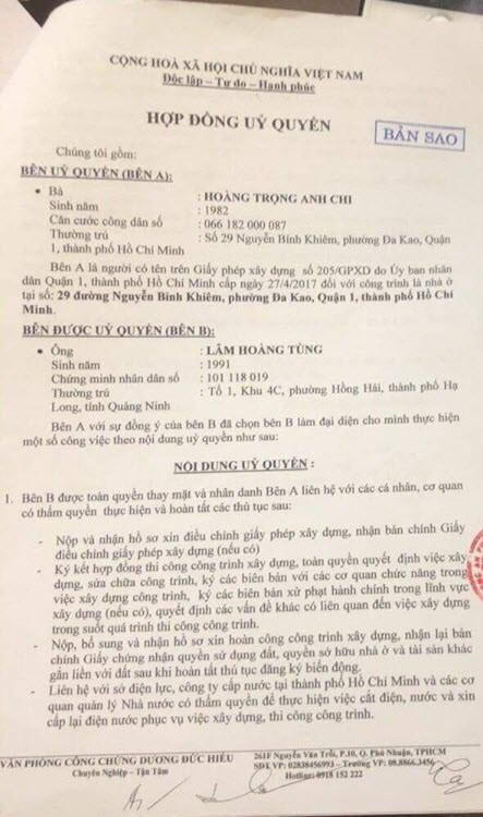 Hợp đồng bà Hoàng Trọng Anh Chi ủy quyền cho ông Lâm Hoàng Tùng đứng ra giải quyết các vấn đề về căn nhà số 29 Nguyễn Bỉnh Khiêm