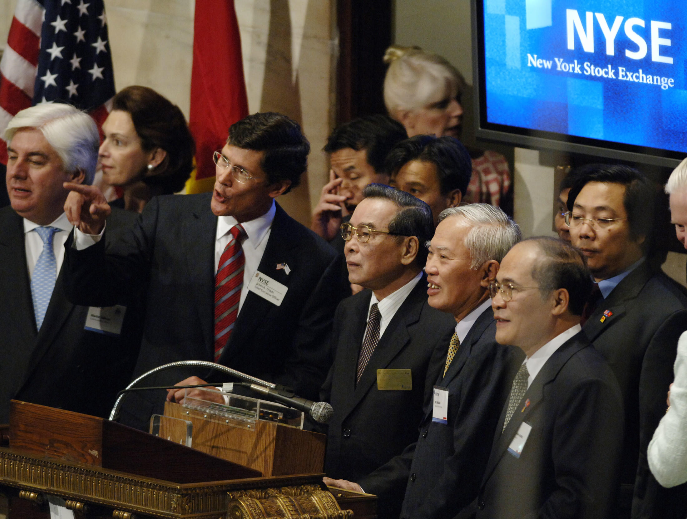 | Thủ tướng Phan Văn Khải và Đoàn đại biểu cấp cao Việt Nam thăm Sàn giao dịch chứng khoán New York, tháng 6/2015. (Nguồn: AFP) |
