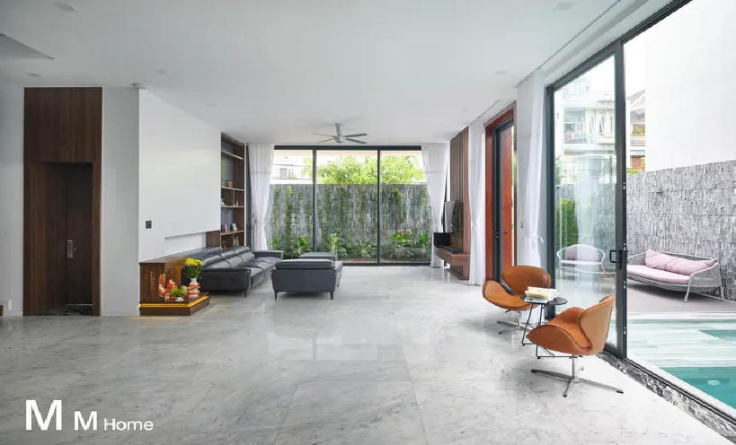 Bể bơi chạy dọc theo chiều dài của không gian sinh hoạt chung. |
