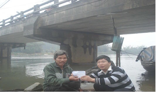Nhà báo Vũ Văn Thắng trao số tiền ủng cho một hoàn cảnh khó khăn sinh sống trên sông Bồ (Thừa Thiên Huế) |