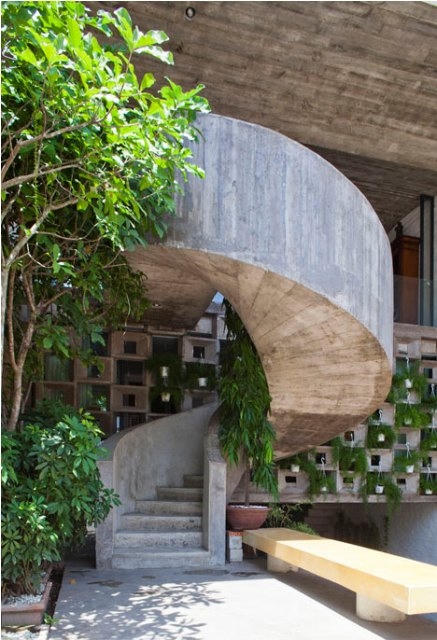 Chiếc cầu thang xoáy ngoài trời độc đáo chạy suốt lên tới tầng 2 của ngôi nhà (Ảnh: ArchDaily) |
