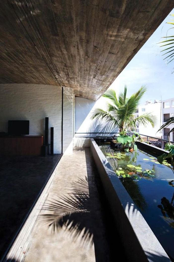 Khu đất nằm ở một vị trí tiếp giáp với hai khu vực trái ngược: một mặt hướng ra đường phố ồn ào, bụi bặm, mặt còn lại nằm gần Thảo cầm viên và một con kênh, với khá nhiều cây xanh. Đặc điểm này khiến kiến trúc sư hướng tới giải pháp về một ngôi nhà thông thoáng tự nhiên, sử dụng tối đa ánh sáng và khí trời. Trên cơ sở đó, kiến trúc sư quyết định sử dụng những khối bê tông đúc sẵn cho công trình, mỗi khối có chiều ngang 60cm, cao 40cm. Những khối bê tông ngoài mặt tiền giúp căn nhà luôn thông thoáng, đón được ánh sáng đẹp mỗi sớm, đồng thời là một cách trang trí lạ mắt.