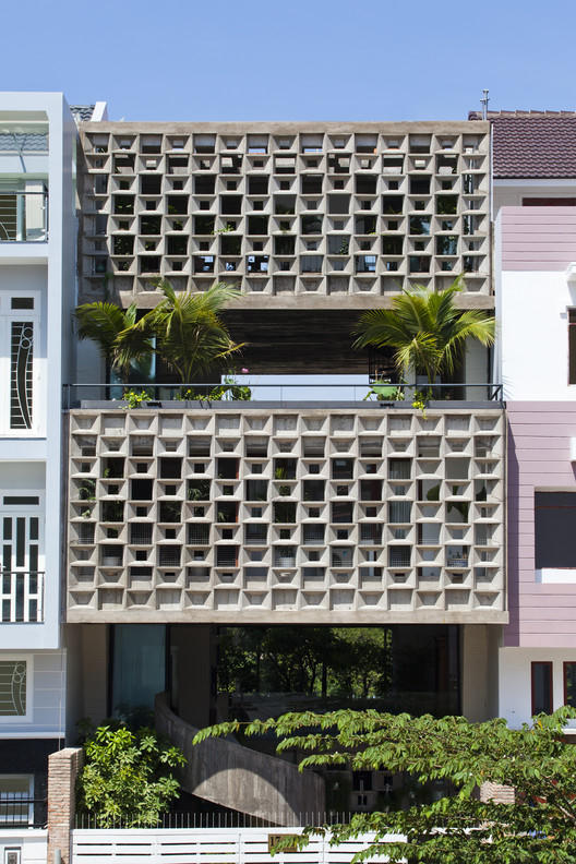 Hai mặt của tầng một, tầng ba và tầng năm được trang trí bởi họa tiết khối rỗng, dẫn ánh sáng chiếu qua phòng ngủ, phòng bếp, phòng ăn nhỏ và phòng gym tại gia.