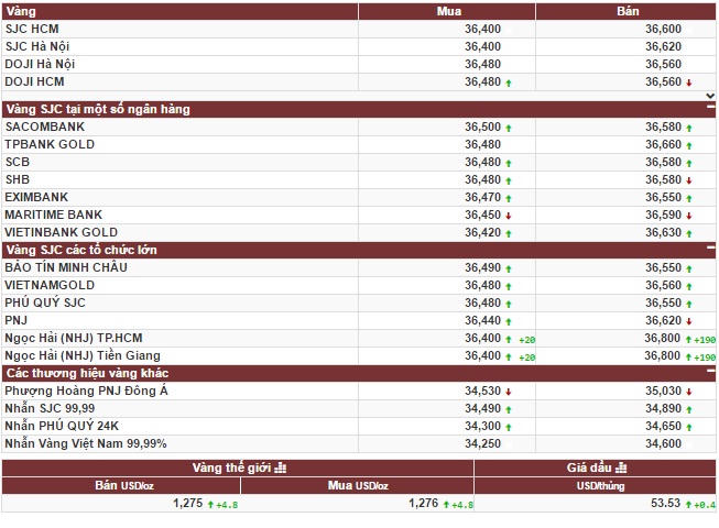 Trong khi đó, giá vàng của Tập đoàn Doji lẻ tại khu vực Hà Nội niêm yết ở mức giá 36,480 – 36,560 triệu đồng/lượng (mua vào – bán ra), giữ nguyên mức giao dịch so với chốt phiên của ngày hôm trước.