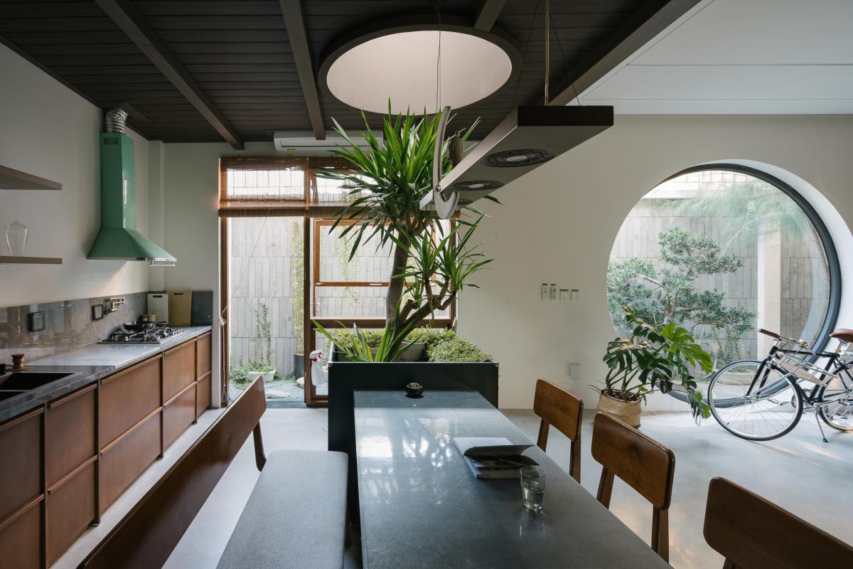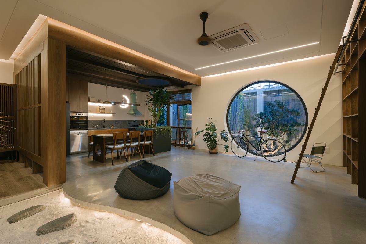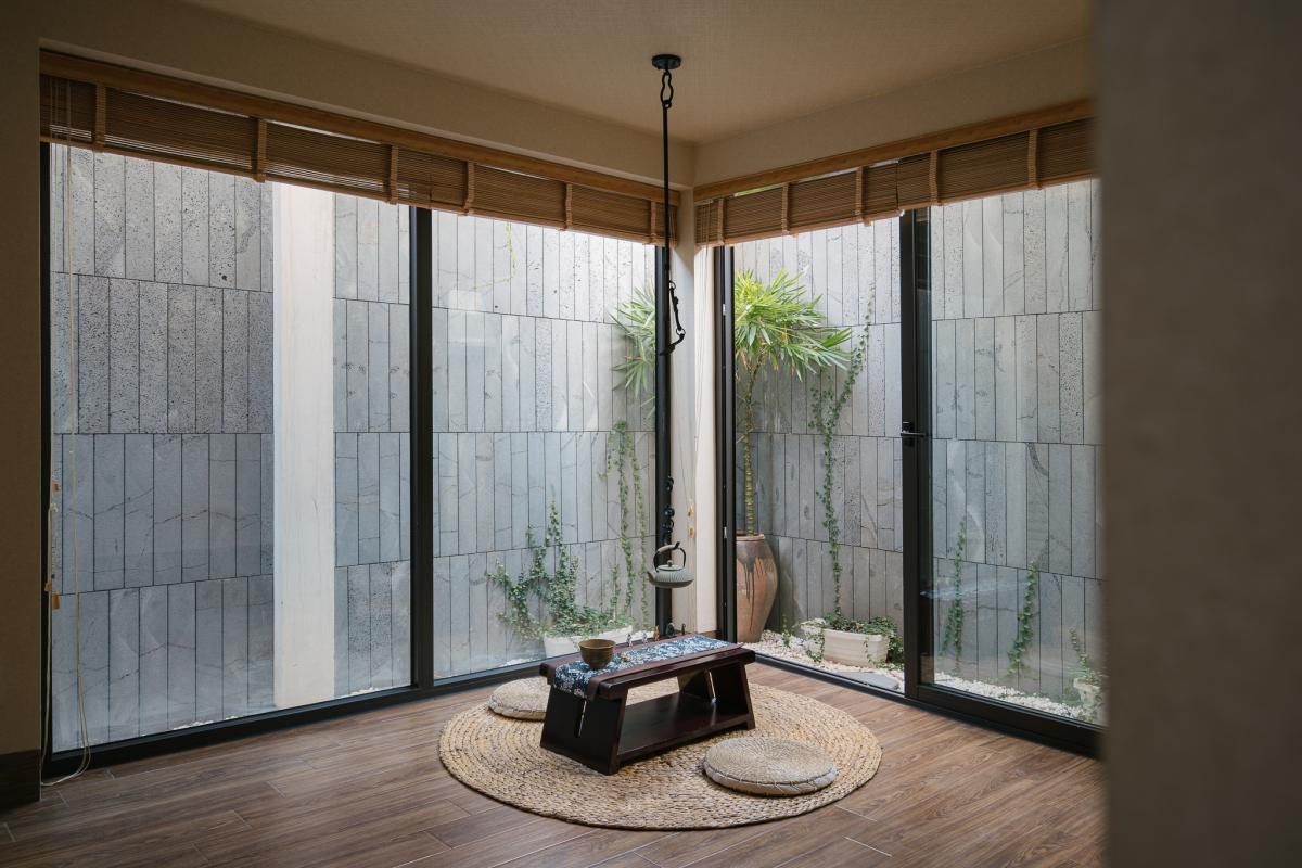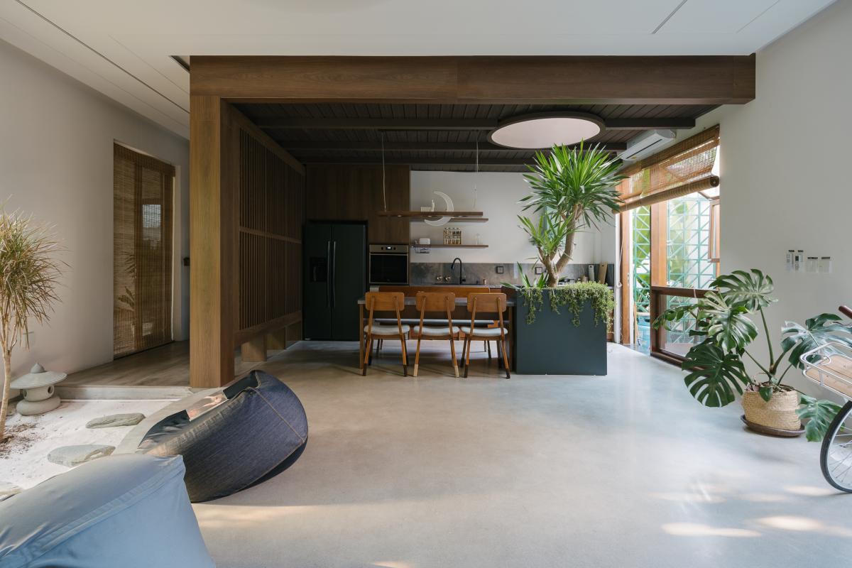Nhà sát một ngôi chùa, xung quanh yên tĩnh, chỉ có tiếng đọc kinh, chuông kêu, chim hót. Muốn nơi ở của mình hòa hợp với cảnh sắc đó, gia chủ chọn làm nhà theo phong cách Zen (thiền), lấy ý tưởng từ những ngôi đền và phòng trà truyền thống Nhật Bản.