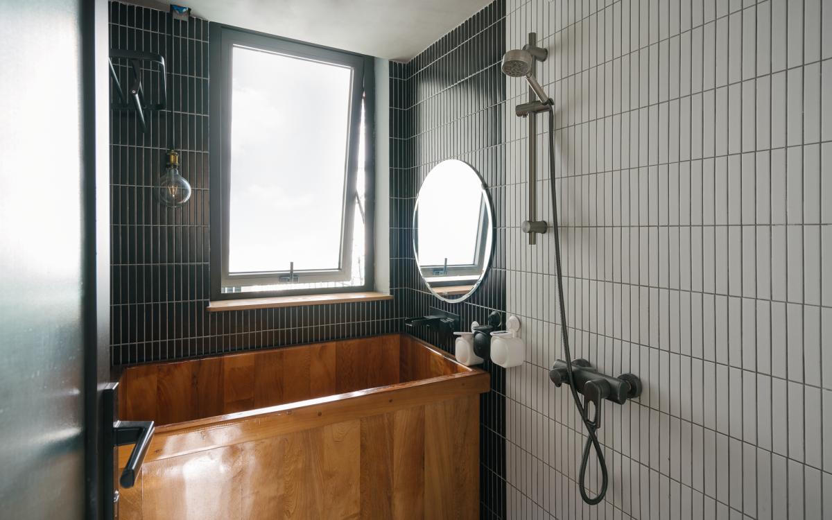 Bồn gỗ trong nhà tắm gợi nhớ những ngôi nhà Nhật cổ.