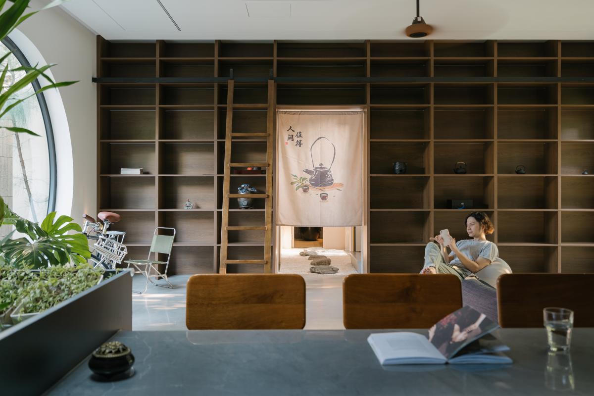 Hệ tủ gỗ kín tường dùng làm nơi bày dụng cụ pha trà cùng những đồ trang trí gia chủ đã sưu tập qua nhiều năm. Nó cũng tạo nên điểm nhấn cho tầng trệt.