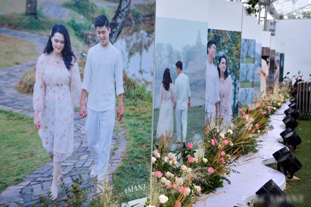 Hai bên đường vào được trang trí bằng hàng loạt những tấm ảnh tình cảm của đôi trẻ.