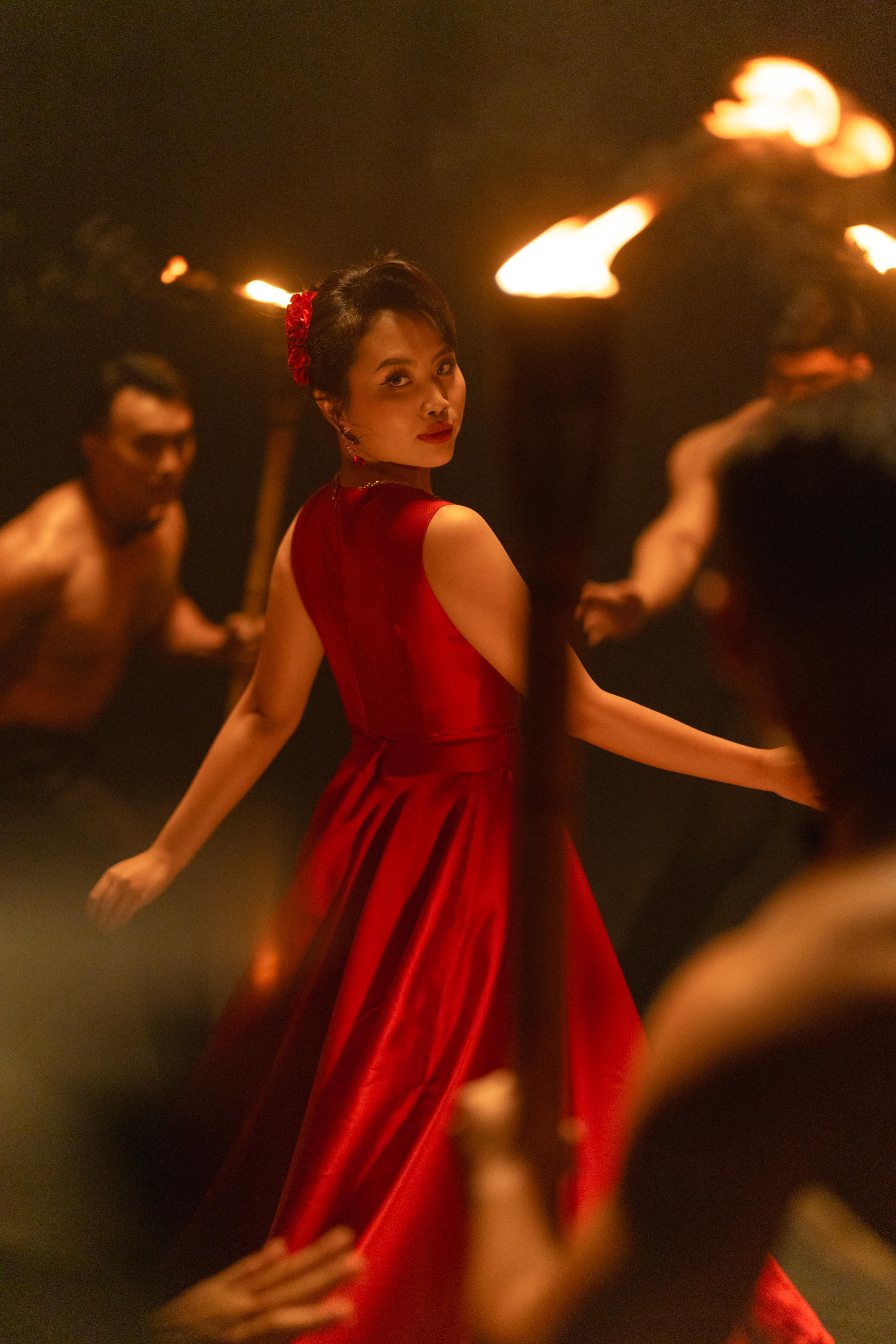 Dù gặp sự cố, nhưng sau đó, Phương Mỹ Chi vẫn cố gắng thực hiện cảnh quay múa lửa thêm một lần nữa vì muốn vượt qua thử thách để đem đến thước phim đẹp nhất.